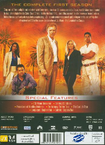 | 505 0 ^adisc 1. Episode 1.Golden Parachute with ; Episode 2. Wet Foot/Dry Foot ; Episode 3. Just OneKiss ; Episode 4. Losing Face --^tdisc 2 Episode 5. Ashes to Ashes ; Episode 6. Broken ; Episode 7. Breathless ; Episode 8.Slaughterhouse --^tdisc 3 Episode 9. Kill Zone ; Episode 10. AHorrible Mind ; Episode 11. Camp Fear ; Episode 12. Entrance Wound --^tdisc 4 Episode 13. Bunk ; Episode 14. Forced Entry ; Episode 15. Dead Woman Walking ; Episode 16. Evidence of Things Unseen --^tdisc 5 Episode 17. Simple Man ; Episode 118. Dispo Day ; Episode 19. Double Cap ; Episode 20. Grave Young Men --^tdisc 6 Episode 21. Spring Break ; Episode 22. Tinder Box ; Episode 23. Freaks and tweaks ; Episode 24. Body Count --^tdisc 7 Special features ; Behind-The-Scenes Featurettes ; CSI : Miami Uncovered ; Creating CSI : Miami ; Procedures of Hangling Evidence ; The Autopsy TheaterTour ; The Gun Lab Tour.