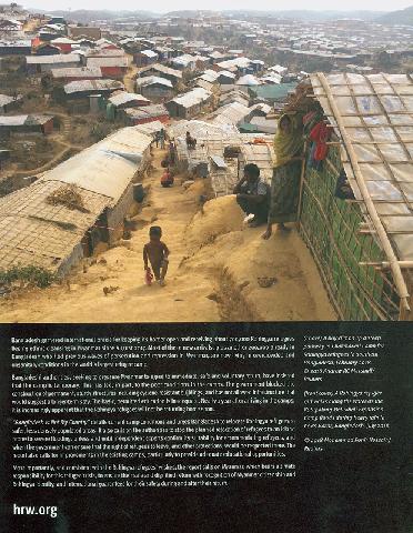 520 ^aThis report is based on a May 2018 visit to Cox's Bazar. Human Rights Watch found that the mega camp is severely overcrowded. The average usable space is 10.7 square meters per person, compared with the recommended international standard of 45 square meters per person. Densely packed refugees are at heightened risk of communicable diseases, fires, community tensions, and domestic and sexual violence. Bangladeshi authorities should relocate Rohingya refugees to smaller, less densely packed camps on flatter, accessible, nearby land within the same Ukhiya subdistrict where the mega camp is located, Human Rights Watch said.--Publisher website, viewed August 14, 2018.