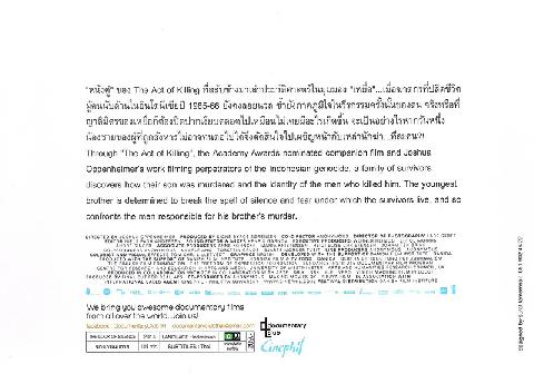 | 520 ^aหนังคู่ ของ The Act of Killing ที่สลับข้างมาเล่าประวัติศาสตร์ในมุมมอง "เหยื่อ"...เมื่อฆาตกรที่ปลิดชีวิตผู้คนนับล้านในอินโนีเซียปี 1965-66 ยังคงลอยนวล ซ้ำยังภาคภูมิใจในวีรกรรมครั้งนั้นของตน จริงหรือที่ญาติมิตรของเหยื่อก็ต้องปิดปากเงียบตลอดไปเหมือนไม่เคยมีอะไรเกิดขึ้น จะเป็นอย่างไรหากวันหนึ่งน้องชายของผู้ที่ถูกสังหารไม่อาจทนต่อไปได้จึงตัดสินใจไปเผชิญหน้ากับเหล่านักฆ่า...ทีละคน