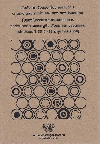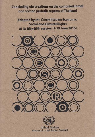 ข้อสังเกตเชิงสรุปเกี่ยวกับรายงานตามระยะฉบับที่หนึ่งและสองของประเทศไทย : รับรองในการประชุมคณะกรรมการว่าด้วยสิทธิทางเศรษฐกิจ สังคม และวัฒนธรรม สมัยประชุมที่ 55 (1-19 มิถุนายน 2558) / คณะมนตรีเศรษฐกิจและสังคมแห่งสหประชาชาติ ; พิภพ อุดมอิทธิพงศ์