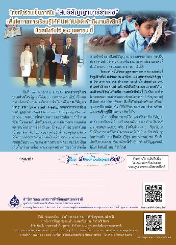-- ไทยเข้าร่วมเป็นภาคีใน "สนธิสัญญามาร์ราเคช" เพิ่มโอกาสการเรียนรู้ให้คนตาบอดเข้าถึงงานลิขสิทธิ์ มีผลบังคับใช้ 28 เมษายน นี้.