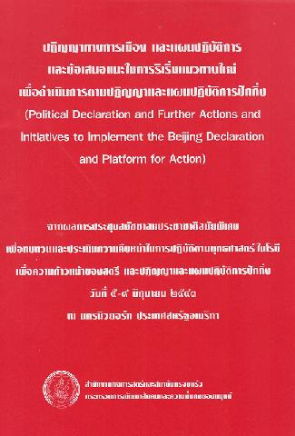 ปฏิญญาทางการเมือง และแผนปฏิบัติการและข้อเสนอแนะในการริเริ่มแนวทางใหม่เพื่อดำเนินการตามปฏิญญาและแผนปฏิบัติการปักกิ่ง : จากผลการประชุมสมัชชาสหประชาชาติสมัยพิเศษ เพื่อทบทวนและประเมินความคืบหน้า ในการปฏิบัติตามยุทธศาสตร์ไนโรบี เพื่อความก้าวหน้าของสตรี วันที่ 5-9 มิุุถุนายน 2543 ณ นครนิวยอร์ก ประเทศสหรัฐอเมริกา สำนักงานคณะกรรมส่งเสริมและประสานงานสตรีแห่งชาติ