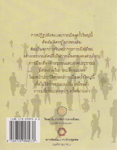 500 ^aการปฏิรูปสังคมและการเมืองครั้งใหญ่นี้ต้องไม่คิดอยู่ในกรอบเดิมต้องเริ่มจากการจินตนาการการเมืองใหม่สร้างกระบวนทัศน์ที่เป็นการเมืองของคนส่วนใหญ่ การเมืองที่องค์กรชุมชนและภาคประชาชนมีส่วนร่วมในการเปลี่ยนแปลงโฉมหน้าประวัติศาสตร์การเมืองครั้งใหญ่นี้เพื่อไม่ให้ซ้ำรอยแบบเดิมเหมือนดังการเปลี่ยนแปลงทุก ๆ ครั้งที่ผ่านมา