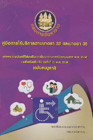 คู่มือการให้บริการตามมาตรา 33 และมาตรา 35 แห่งพระราชบัญญัติส่งเสริมและพัฒนาคุณภาพชีวิตคนพิการ พ.ศ. 2550 และทีแก้ไขเพิ่มเติม (ฉบับที่ 2) พ.ศ. 2556 (ฉบับสมบูรณ์) / กองพัฒนาระบบบริการจัดหางาน กรมการจัดหางาน