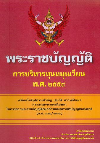 พระราชบัญญัติการบริหารทุนหมุนเวียน พ.ศ. 2558 : พร้อมทั้งบทสรุปสาระสำคัญ ประวัติ ความเป็นมา กระบวนการ และขั้นตอนในการตราพระราชบัญญัติดังกล่าวของสภานิติบัญญัติแห่งชาติ (ก.ป. 178/2559) / กลุ่มงานพัฒนากฎหมาย สำนักกฎหมาย สำนักงานเลขาธิการวุฒิสภา.