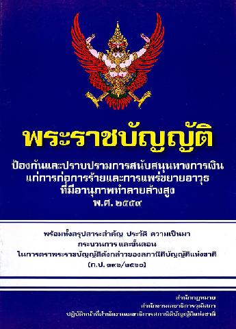 พระราชบัญญัติป้องกันและปราบปรามการสนับสนุนทางการเงินแก่การก่อการร้ายและการแพร่ขยายอาวุธที่มีอานุภาพทำลายล้างสูง พ.ศ. 2559 : พร้อมทั้งสรุปสาระสำคัญ ประวัติ ความเป็นมา กระบวนการ และขั้นตอนในการตราพระราชบัญญัติดังกล่าวของสภานิติบัญญัติแห่งชาติ (ก.ป. 1962560) สำนักกฎหมาย สำนักงานเลขาธิการวุฒิสภา ปฏิบัติหน้าที่สำนักงานเลขาธิการสภานิติบัญญัติแห่งชาติ