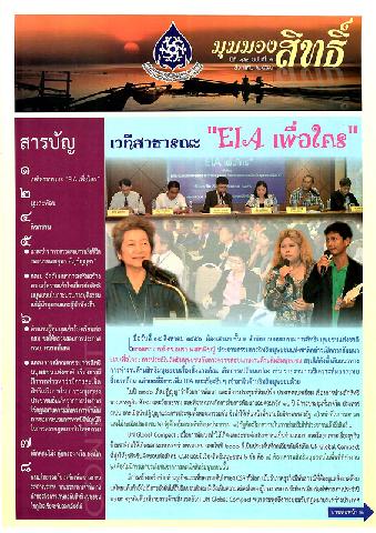 505 0 ^aเวทีสาธารณะ EIA เพื่อใคร --^tแถลงข่าว การตรวจสอบการเสียชีวิตของนายเอกยุทธ อัญชันบุตร --^tกสม. จัดสัมมนาการเสริมสร้างความรู้ความเข้าใจเกี่ยวกับสิทธิมนุษยชนในกระบวนการยุติธรรมแก่ผู้นำชุมชนและผู้นำท้องถิ่น --^tแถลงการณ์คณะกรรมการสิทธิมนุษยชนแห่งชาติ เรื่องกรณีมีการกล่าวหาว่ามีการละเมิดสิทธิเสรีภาพในการชุมนุมของประชาชน อันเกิดจากการประกาศใช้กฎหมายความมั่นคง การดำเนินการของกระบวนการทางนิติบัญญัติในการตรากฎหมายนิรโทษกรรม --^tเด็กคลุมโม่งคุ้มครองหรือละเมิด --^tกสม. ไทยร่วมกับองค์กรพัฒนาเอกชนระหว่างประเทศ หาแนวทางการดำเนินงานด้านธุรกิจการเกษตรกับสิทธิมนุษยชนในภูมิภาคเอเชียตะวันออกเฉียงใต้.