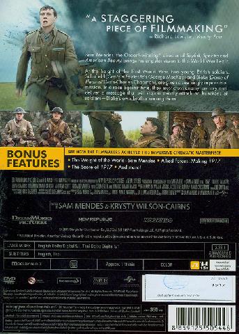 | 245 00 ^a1917^h[videorecording] /^cA DreamWorks Pictures and Reliance Entertainment presentation ; in association with New Republic Pictures ; A Neal Street Production ; produced in association with Mogambo ; directed by Sam Mendes ; written by Sam Mendes & Krysty Wilson-Cairns ; produced by Sam Mendes, Pippa Harris, Jayne-Ann Tenggren, Callum McDougall, Brian Oliver.