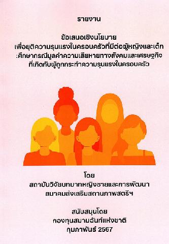 รายงานข้อเสนอเชิงนโยบายเพื่อยุติความรุนแรงในครอบครัวที่มีต่อผู้หญิงและเด็ก : ศึกษากรณีมูลค่าความเสียหายทางสังคมและเศรษฐกิจที่เกิดกับผู้กระทำความรุนแรงในครอบครัว / สถาบันวิจัยบทบาทหญิงชายและการพัฒนา สมาคมส่งเสริมสถานภาพสตรี ในพระอุปถัมภ์ พระเจ้าวรวงศ์เธอ พระองค์เจ้าโสมสวลี กรมหมื่นสุทธนารีนาถ สนับสนุนโดย กองทุนสมานฉันท์แห่งชาติ