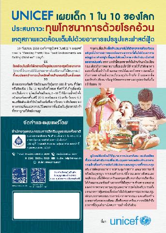 -- UNICEF เผยเด็ก 1 ใน 10 ของโลก ประสบภาวะทุพโภชนาการด้วยโรคอ้วนเหตุสภาพแวดล้อมเต็มไปด้วยอาหารแปรรูปและฟาสต์ฟู้ด.