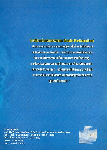 รายงานการวิจัยเรื่อง แนวทางการเสริมสร้างประชาธิปไตยแบบมีส่วนร่วมตามรัฐธรรมนูญแห่งราชอาณาจักรไทย พ.ศ. 2540 : ปัญหาอุปสรรค และทางออก จัดทำโดย คนึงนิจ ศรีบัวเอี่ยม ...[และคนอื่นๆ] ; ถวัลย์รัฐ วรเทพพุฒิพงษ์, บรรณาธิการ