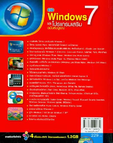 Contents: เริ่มต้นกับ windows 7 และคอมพิวเตอร์ -- คุณสมบัติน่าสนใจใน Windows 7 และการติดตั้ง -- เริ่มต้นใช้งาน Windows 7 -- ปรับแต่ง Windows 7 -- ใช้งาน Control panel -- จัดการกับไฟล์ โฟลเดอร์ และ โปรแกรม -- เขียนข้อมูลลงแผ่นด้วย Windows 7 -- ติดตั้งโปรแกรม และฟอนต์เพิ่มเติม -- ติดตั้งพริ้นเตอร์ -- ปรับแต่ง User account -- โปรแกรมช่วยงานใน Windows 7 -- จัดการรูปภาพ -- ดูหนังฟังเพลงใน Windows 7 -- ตัดต่อวิดีโอ แชร์ขึ้นเว็บและเขียนลงแผ่น -- เล่นเกมส์บน Windows 7 -- รับส่งแฟ๊กซ์และสแกน -- ใช้โปรแกรมรุ่นเก่าผ่าน Windows XP mode -- อินเทอร์เน็ตและการเชื่อมต่อ -- ท่องโลกอินเทอร์เน็ตด้วย Internet explorer 8 -- จัดการอีเมล์ด้วย Windows live mail -- แชทด้วย Windows live messenger -- ระบบเครือข่ายใน Windows 7 -- แชร์ข้อมูลและอินเทอร์เน็ต -- เชื่อมต่ออุปกรณ์ต่างๆ -- การดูแลรักษาระบบและปัญหาใน Windows 7 -- ระบบรักษาความปลอดภัยใน Windows 7 -- ระบบจัดการพลังงาน (Power options) -- เทคนิคใช้งานWindows 7