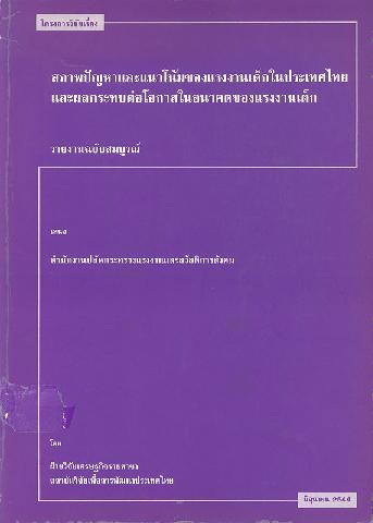 โครงการวิจัยเรื่อง สภาพปัญหาและแนวโน้มของแรงงานเด็กในประเทศไทยและผลกระทบต่อโอกาสในอนาคตของแรงงานเด็ก : รายงานฉบับสมบูรณ์ โดย ฝ่ายวิจัยเศรษฐกิจรายสาขา สถาบันวิจัยเพื่อการพัฒนาประเทศไทย ; คณะผู้วิจัย, นิพนธ์ พัวพงศกร ... [และคนอื่นๆ]