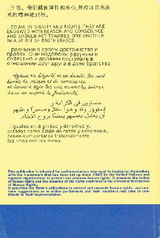 Contents: What are human rights? -- What State obligations arise from human rights? -- International human rights instruments -- May Governments restrict human rights? -- United Nations human rights treaty-monitoring bodies -- Charter-based system of human rights protection and the United Nations Commission on Human Rights -- The Office of the United Nations High Commissioner for Human Rights -- Integrating human rights into the work of the United Nations -- Regional human rights treaties and monitoring -- Combating impunity : the International Criminal Court (ICC) -- The role of parliamentarians in the protection and promotion of human rights -- What parliamentarians should know about the civil and political rights contained in the Universal Declaration of Human Rights -- What parliamentarians should know about the economic, social and cultural rights contained in the Universal Declaration of Human Rights.
