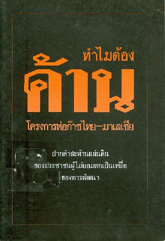 245 00 ^aทำไมต้องค้านโครงการท่อก๊าซไทย-มาเลเซีย :^bปากคำสะท้านแผ่นดินของประชาชน ผู้ไม่ยอมตกเป็นเหยื่อของการพัฒนาและลำดับเหตุการณ์กรณีท่อก๊าซไทย-มาเลเซีย 2522-2543 /^cคณะกรรมการประสานงานองค์กรพัฒนาเอกชน (กป.อพช.ใต้)