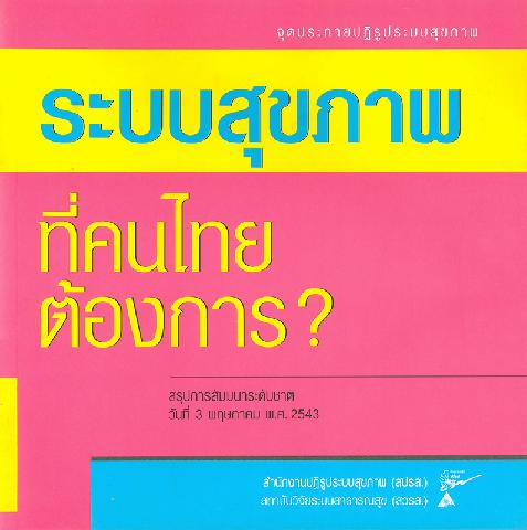 ระบบสุขภาพที่คนไทยต้องการ? : สรุปการสัมมนาระดับชาติ วันที่ 3 พฤษภาคม พ.ศ. 2543 สำนักงานปฏิรูประบบสุขภาพ (สปรส.), สถาบันวิจัยระบบสาธารณสุข (สวรส.) ; บรรณาธิการ, ขวัญใจ เอมใจ