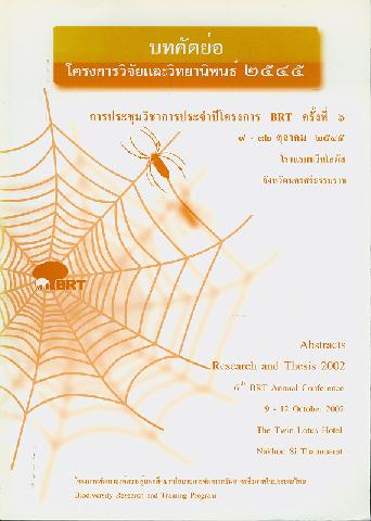 บทคัดย่อโครงการวิจัยและวิทยานิพนธ์ 2545 : การประชุมวิชาการประจำปีโครงการ BRT ครั้งที่ 6 9-12 ตุลาคม 2545 โรงแรมทวินโลตัส จังหวัดนครศรีธรรมราช / โครงการพัฒนาความรู้และศึกษานโยบายการจัดการทรัพยากรชีวภาพในประเทศไทย ; บรรณาธิการ, วิสุทธิ์ ใบไม้ และ รังสิมา ตัณฑเลขา