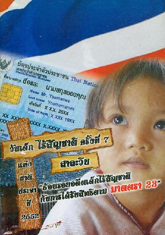วันเด็กไร้สัญชาติ ครั้งที่ 7 สาละวิน : ย้อนรอยอดีตเด็กไร้สัญชาติกับการได้รับสิทธิตามมาตรา 23/ บรรณาธิการ สันติพงษ์ มูลฟอง และ เลาพั้ง บัณฑิตเทอดสกุล