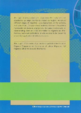 Summary: Reviews policies and programmes the Philippines has adopted as an origin country to protect its migrant workers at different stages of migration - pre-deployment, at the worksite, and upon return. Looks in detail at features of regulatory frameworks for overseas employment, the varied mechanisms for disseminating clear and vital information to migrants and their families, and what institutional structures need to be present to ensure fair application of rules to migrants.