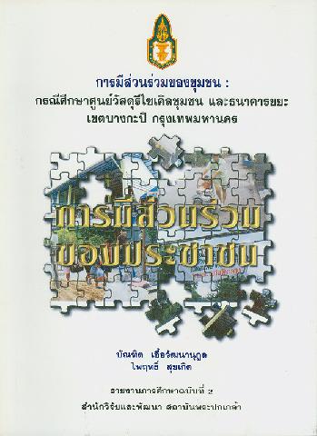 รายงานการศึกษาการมีส่วนร่วมของชุมชน : กรณีศึกษาศูนย์วัสดุรีไซเคิลชุมชน และธนาคารขยะ เขตบางกะปิ กรุงเทพมหานคร บัณฑิต เอื้อวัฒนานุกูล และไพฤทธิ์ สุขเกิด ; ถวิลวดี บุรีกุล บรรณาธิการ