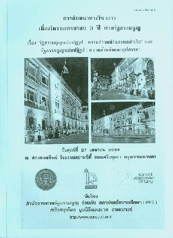 การสัมมนาทางวิชาการเนื่องในวาระครบรอบ 3 ปี ศาลรัฐธรรมนูญ เรื่อง "รัฐธรรมนูญฉบับปฏิรูป : ความก้าวหน้าและผลสำเร็จ" และ "รัฐธรรมนูญฉบับปฏิรูป : ความล้าหลังและอุปสรรค" วันศุกร์ที่ 27 เมษายน 2544 ณ ห้องกมลทิพย์ โรงแรมสยามซิตี้ ถนนศรีอยุธยา กรุงเทพมหานคร / สำนักงานศาลรัฐธรรมนูญ ร่วมกับ สถาบันนโยบายศึกษา