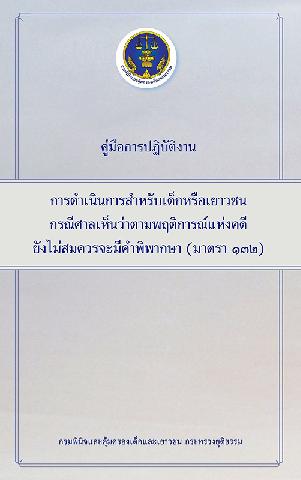 คู่มือการปฏิบัติงานการดำเนินการสำหรับเด็กหรือเยาวชนกรณีศาลเห็นว่าตามพฤติการณ์แห่งคดียังไม่สมควรจะมีคำพิพากษา (มาตรา 132) / สำนักพัฒนาระบบงานยุติธรรมเด็กและเยาวชน กรมพินิจและคุ้มครองเด็กและเยาชน กระทรวงยุติธรรม