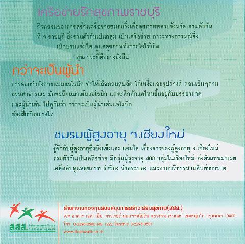 505 ^aเครือข่ายรักสุขภาพราชบุรี --^tกว่าจะเป็นผู้นำ --^tชมรมผู้สูงอายุ จ.เชียงใหม่