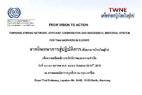 จากจินตนาการสู่ปฏิบัติการเพื่อแรงงานไทยในยุโรปเพื่อความเข้มแข็ง ประสิทธิภาพและความสำเร็จ : วันที่ 30-31 ตุลาคม พ.ศ. 2553 ณ สถานเอกอัครราชทูตไทย ณ กรุงเบอร์ลิน เครือข่ายหญิงไทยในยุโรป