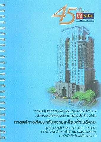 การประชุมวิชาการระดับชาติในวันคล้ายวันสถาปนาสถาบันบัณฑิตพัฒนบริหารศาสตร์ ประจำปี 2554 : ศาสตร์การพัฒนากับความเหลื่อมล้ำในสังคม วันที่ 1 เมษายน 2554 ณ หอประชุมเฉลิมพระเกียรติ 6 รอบพระชนมพรรษา / สถาบันบัณฑิตพัฒนบริหารศาสตร์