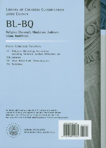 Library of Congress classification. BL-BQ : Religion (general), Hinduism, Judaism, Islam, Buddhism / prepared by the Cataloging Policy and Support Office, Library Services