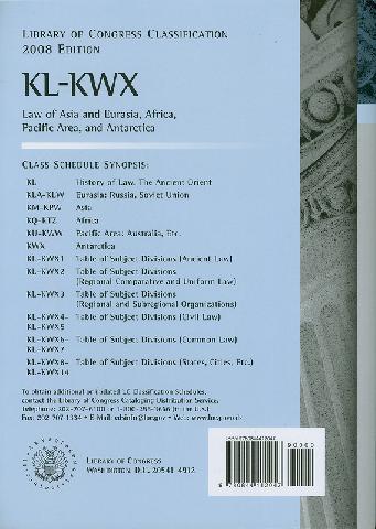 Library of Congress classification. KL-KWX : Law of Asia and Eurasia, Africa, Pacific Area, and Antarctica prepared by the Cataloging Policy and Support Office, Library Services