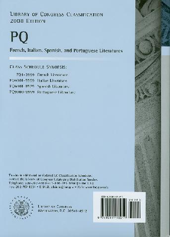 Library of Congress classification. PQ : French, Italian, Spanish, and Portuguese literatures prepared by the Cataloging Policy and Support Office, Library Services