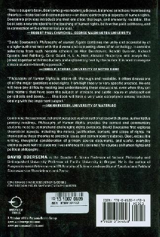 Summary: Combining the sustained, coherent perspective of anauthored text with diverse, authoritative primary readings,Philosophy of Human Rights provides the context andcommentary students need to comprehend challenging rightsconcepts. David Boersema first explores theoreticalaspects, including the nature, justification, content, andscope of rights. He then applies these theories topractical issues and contemporary debates. Clear,accessible writing, thoughtful consideration of primarysource documents, and useful, everyday examples pertinentto students^' lives enhance this core text for courses onhuman rights and political philosophy. --Book Jacket
