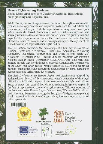 Summary: This publication documents the proceedings of a four day conference on Human Rights and Agribusiness: Plural Legal Approaches to Conflict Resolution, Institutional Strengthening and Legal Reform (Bali, 28th November 1st December 2011), convened by the Indonesian Governments National Human Rights Commission (Komnas HAM). This high level meeting brought together the heads of human rights commissions of the region, notable academics, NGOs and indigenous peoples organisations with the purpose of developing a regional standard on human rights and agribusiness. The Bali Declaration on Human Rights and Agribusiness which resulted from this meeting, reminds companies of their legal obligation to fulfill their responsibilities to respect human rights and calls on States to protect the rights of their citizens, including indigenous peoples, in the face of unprecedented pressures from agribusiness.