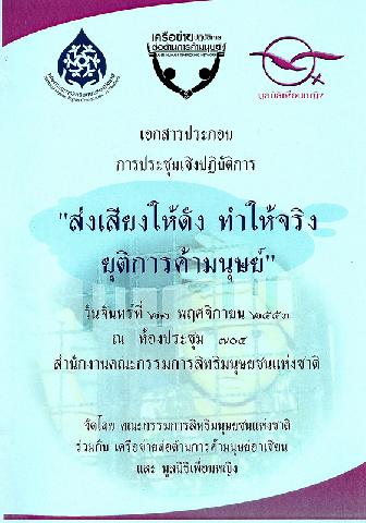 เอกสารประกอบการประชุมเชิงปฏิบัติการ : "ส่งเสียงให้ดัง ทำให้จริง ยุติการค้ามนุษย์", วันจันทร์ที่ 12 พฤศจิกายน 2553 ณ ห้องประชุม 704 สำนักงานคณะกรรมการสิทธิมนุษยชนแห่งชาติ / สำนักงานคณะกรรมการสิทธิมนุษยชนแห่งชาติ, เครือข่ายต่อต้านการค้ามนุษย์อาเซียน, มูลนิธิเพื่อนหญิง